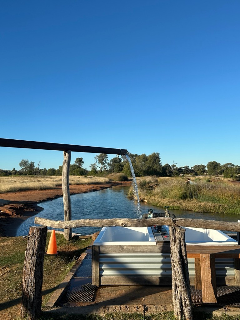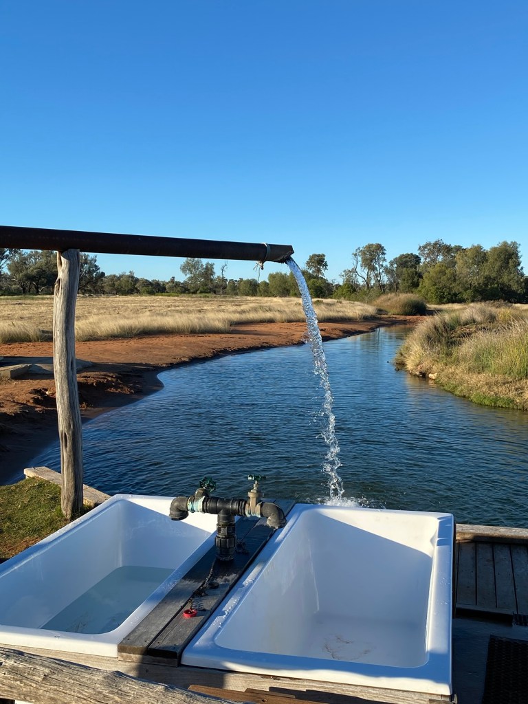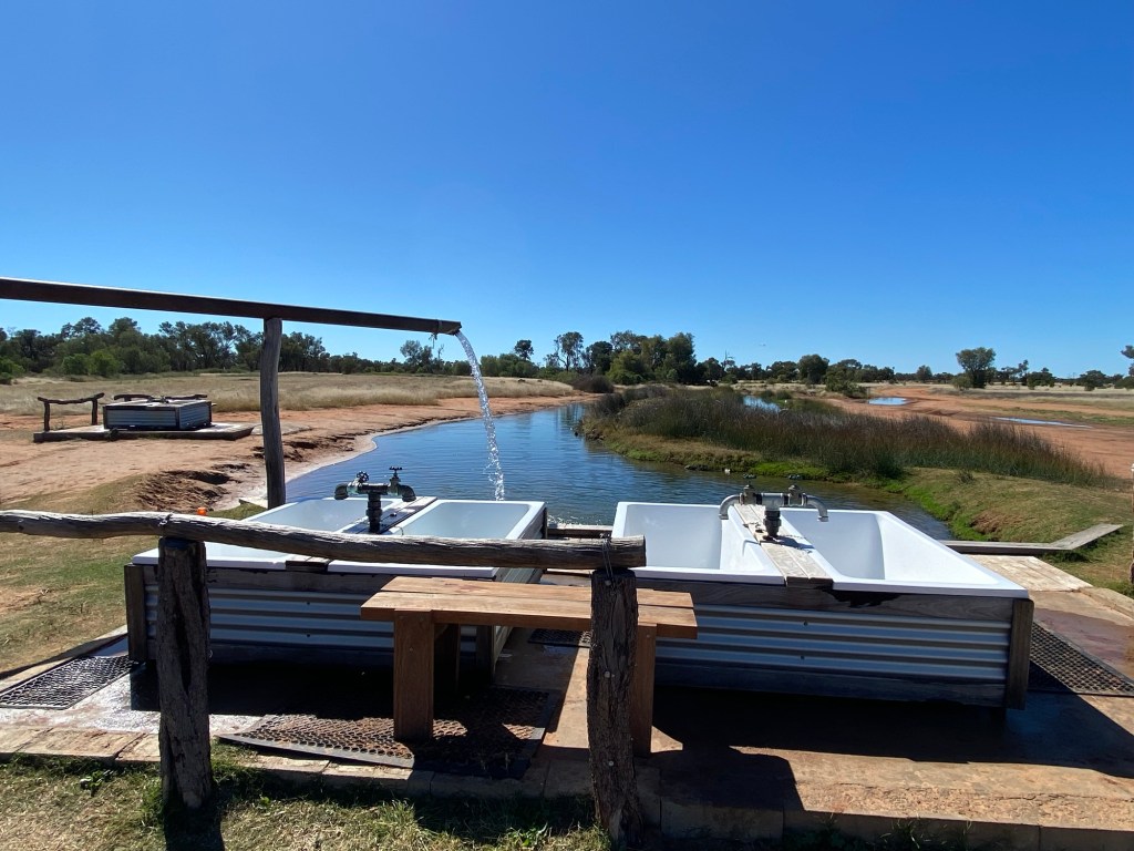 We did a walk around the campfire until to check out the hot bore pool and it did look inviting. The water comes out of the bore at 42°. Scattered along the bore drain are bathtubs in sets of two. Anyone can hop in, fill up the tub and soak in the lovely hot artesian water.