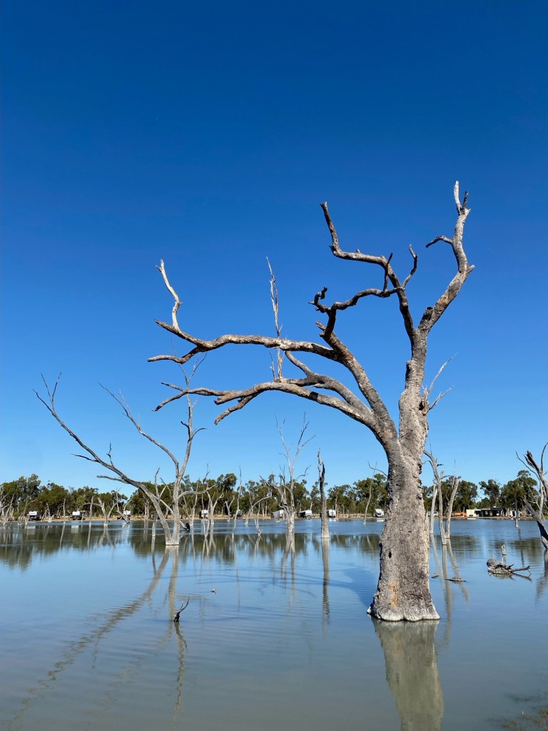 We’ve camped at Cobar many times and we drove directly out to our favourite spot at the Old Resevoir. This is a fabulous free camp next to the old reservoir and the road to get there is all tar until you arrive at the res. Then it becomes a red dirt track. Evidence of the recent rains was in the huge potholes and gutters so it was slow going getting in. Council have still not put any gravel in the huge pothole near a big tree and it was full of water so we had to go around a tree as we’ve had to do before. It’s a well worn track around the tree now.