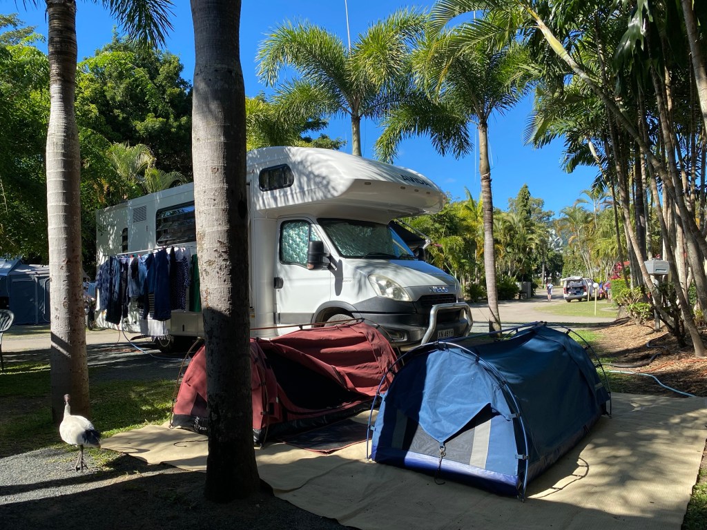 We had two sites next to each other and as the motorhome is our only vehicle we had plenty of room. Most sites allow for a car then the slab then the caravan. Our site only has our motorhome then the slab with our awning over it then a large space between us and Katie where a car would usually go.
